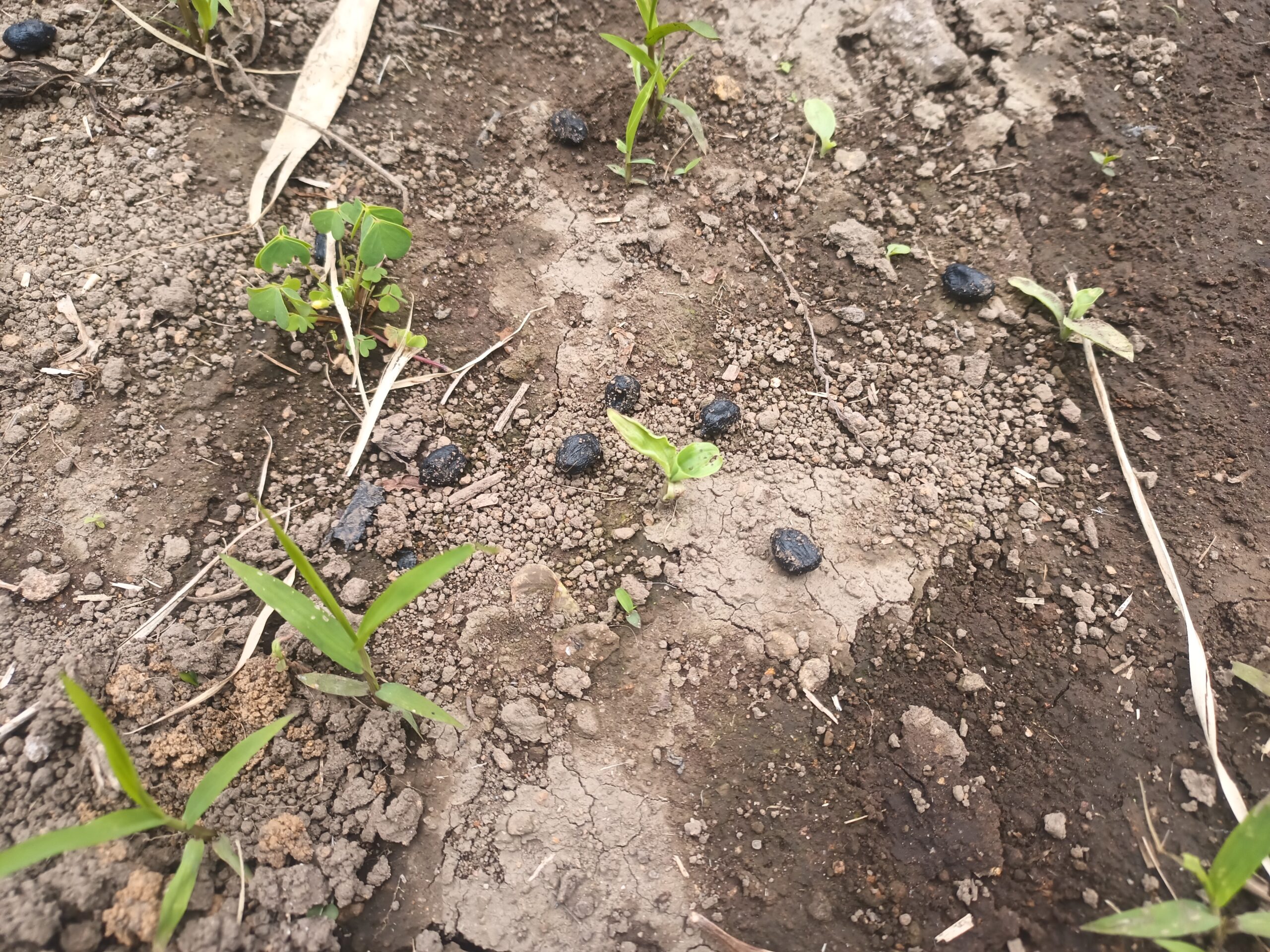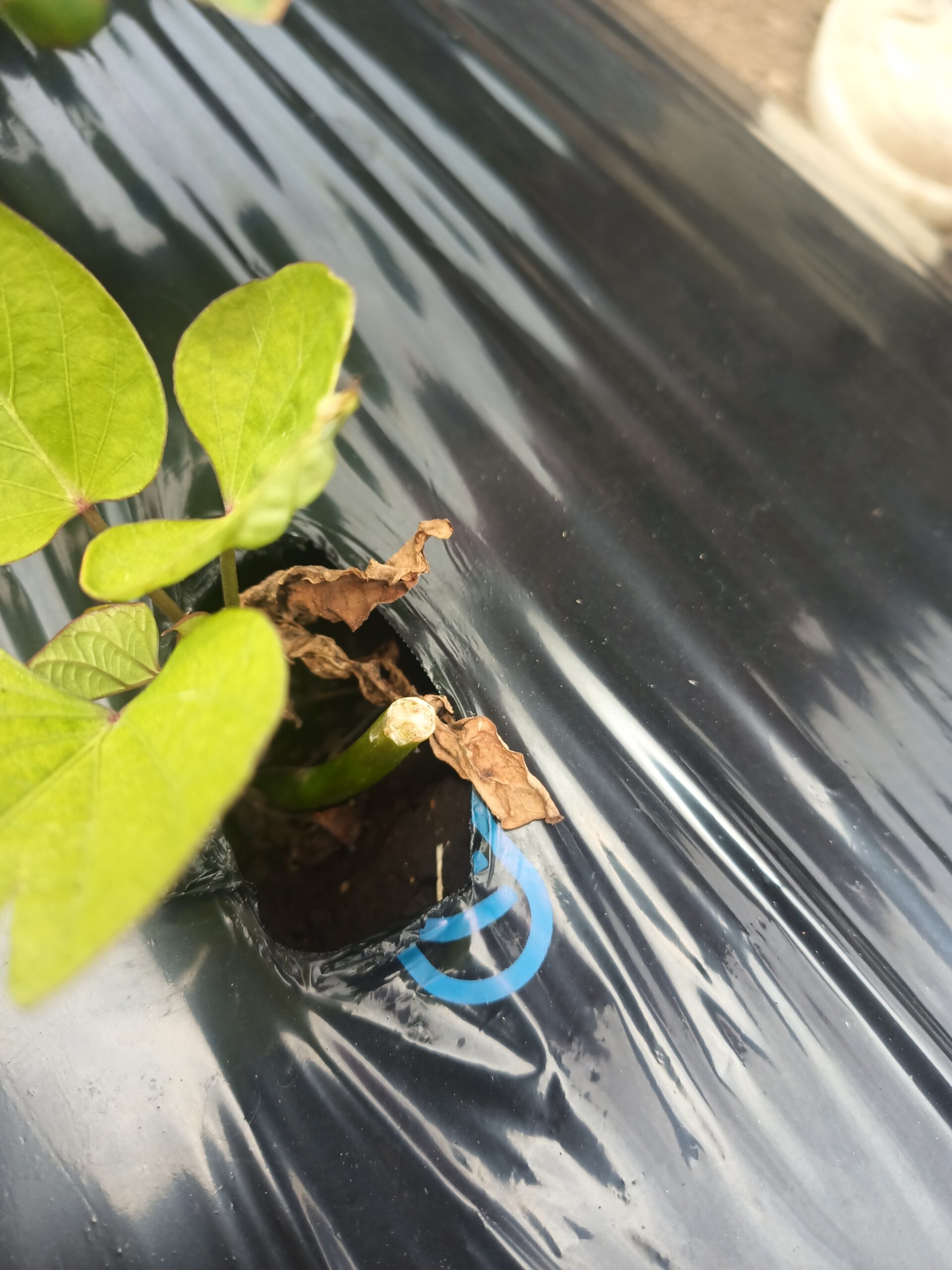 植え付けた圃場の見回りを蔵の職員でしていたら、ところどころ茎がスパっと切れている株を発見しました。その近くにマルチが破れている箇所もあったので、もしかしてノヤギが入ってきたのでは?と畑を調査していたところ・・・、